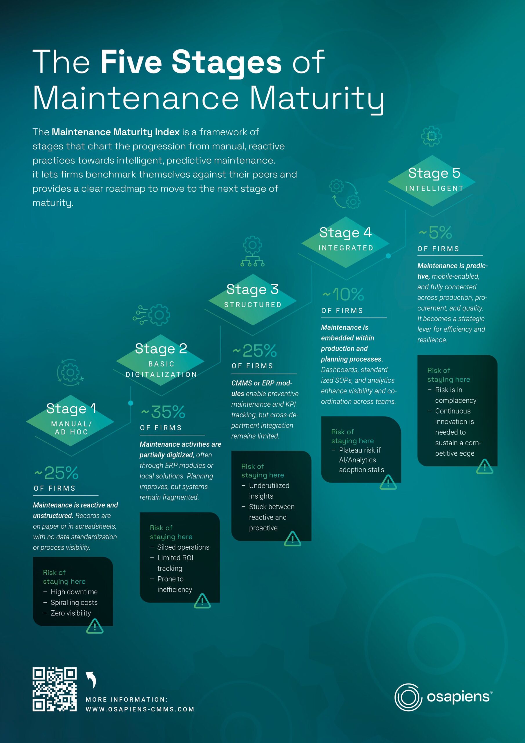 Para el estudio, Fraunhofer IML y osapiens han desarrollado un Índice de Madurez del Mantenimiento. Este modelo de cinco etapas muestra cómo las empresas avanzan desde prácticas manuales y reactivas hacia un mantenimiento inteligente y predictivo. Permite a las empresas compararse con sus pares y ofrece una hoja de ruta práctica.
